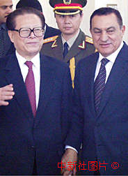 中國國家主席江澤民4月17日抵達(dá)埃及的亞歷山大,與埃及總統(tǒng)穆巴拉克會(huì)晤。中新社記者 彭偉祥 攝
