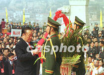 圖文:海內(nèi)外華夏子孫公祭黃帝陵 2001年4月6日 08:01 ![]() 陜西黃帝陵大祭祖。中新社記者 宋吉河 攝 ![]() 王光英向軒轅黃帝畫像敬獻花籃。中新社記者 宋吉河 攝 ![]() 萬國權(quán)向軒轅黃帝畫像敬獻花籃。中新社記者 宋吉河 攝 中新社西安四月五日電(王彥平)清明節(jié)的黃帝陵,雨后初霽,陽光普照,農(nóng)歷辛巳年公祭軒轅黃帝典禮今天在此隆重舉行。 今天在象征九五之尊的九點五十分,公祭典禮正式開始。全場肅立后,代表三十四個省、市、自治區(qū)和特別行政區(qū)的三十四響禮炮響起,人們的目光投向空中,仿佛在聆聽中國十二億九千五百萬華夏子孫和眾多海外同胞向中華人文初祖所要表達的殷殷懷念與追思。 海內(nèi)外各界參祭代表,在入口廣場肅立靜候片刻后,隨古樸、莊嚴的祭祀儀俯隊,過軒轅橋觀龍尾道,來到軒轅廟前。 隨后鼓樂齊鳴,在威武的禮儀士兵引領(lǐng)下,全國人大常委會副委員長王光英、全國政協(xié)副主席萬國權(quán)等分別向黃帝像敬獻花籃。 在身著盛裝的禮儀小姐們向始祖敬獻了鮮花、時果等祭品后,陜西省省長程安東恭讀了辛巳年清明公祭軒轅黃帝祭文。 最后,所有參祭的各界代表向黃帝像行三鞠躬大禮。(完) |