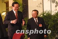 ![]() 中國外交部長唐家璇與九屆全國人大五次會議新聞發(fā)言人曾建徽,六日走出人民大會堂記者招待會現(xiàn)場。唐家璇在會上說,中國入世有利于香港繼續(xù)維持包括國際金融中心在內的三個國際中心地位。中新社記者 劉殊瑾 攝