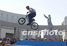 ![]() 極限輪滑選手七日在吉林市世紀廣場的毛澤東塑像前表演。中新社圖 寧秀英 攝