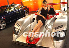 ![]() 一名黑衣模特躺在身經(jīng)百戰(zhàn)的銀色賽車上,使北京六月的國際汽車展富于美女名車的剛?cè)嶂。賈國榮 攝
