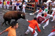 圖:西班牙奔牛節(jié)造成多人受傷 2002年07月08日 19:59 ![]() 7月6日,一年一度的奔牛節(jié)在西班牙潘普洛納市拉開帷幕;顒(dòng)當(dāng)天,就有數(shù)人在斗?癖歼^程中被牛角刮傷。據(jù)稱,今年的奔牛節(jié)是近年來最危險(xiǎn)的一次。圖為奔跑的人們引領(lǐng)著瘋狂的公牛。(春風(fēng))