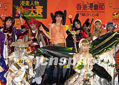 ![]() 歌星梁詠琪23日在香港出席第四屆香港漫畫節(jié)舉辦之《2002漫畫人物扮(左口右野)大賽準決賽》出任嘉賓,賽后與部份入圍決賽的參加者一起合照。鄧慶樂 攝