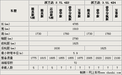 國(guó)產(chǎn)漢蘭達(dá)的車(chē)身尺寸與進(jìn)口車(chē)型相同,由于國(guó)產(chǎn)漢蘭達(dá)精英型沒(méi)有配備車(chē)頂行李架,所以要比運(yùn)動(dòng)版、豪華版和至尊版矮了30mm。將近2.8米的軸距為漢蘭達(dá)提供了舒適的內(nèi)部空間。國(guó)產(chǎn)漢蘭達(dá)較進(jìn)口車(chē)型有添加了5座車(chē)型,進(jìn)一步滿足了不同消費(fèi)者的需求(進(jìn)口車(chē)型均為7座車(chē)型)。國(guó)產(chǎn)漢蘭達(dá)的轉(zhuǎn)彎半徑僅為5.9米,保證了該車(chē)型的道路通過(guò)性。