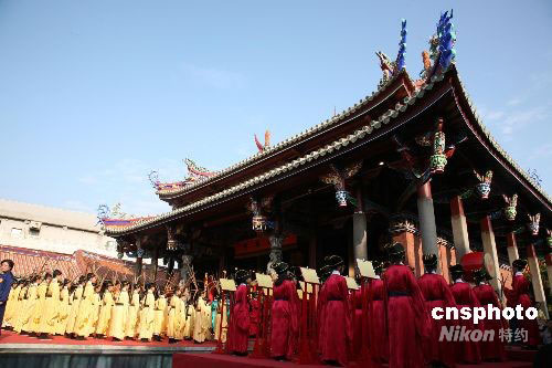 今年是孔子誕辰二千五百五十八周年,原應(yīng)九月二十八日舉行的臺(tái)北祭孔大典,因強(qiáng)臺(tái)風(fēng)“薔薇”來襲而延至十月五日進(jìn)行。中新社發(fā) 楊旭 攝