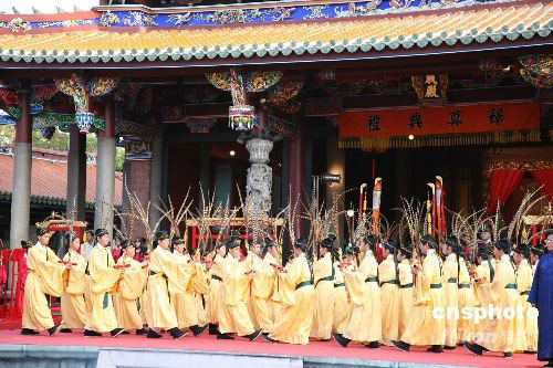 十月五日舉行的臺(tái)北祭孔大典與往年不同,佾舞及雅樂(lè)演出由六佾變?yōu)榘速从闪辛腥,增加到八行八列六十四名佾生。中新社發(fā) 楊旭 攝