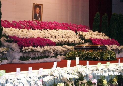 臺(tái)塑企業(yè)創(chuàng)辦人王永慶的遺體十七日由長(zhǎng)榮班機(jī)運(yùn)抵臺(tái)灣,靈堂設(shè)在桃園縣的長(zhǎng)庚大學(xué)活動(dòng)中心。圖為棺木安放在靈堂內(nèi)景。中新社發(fā) 耿軍 攝