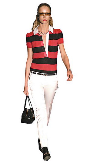 一直以來(lái)走性感路線的BottegaVeneta在2006年春夏推出了搶眼的紅白條紋短裝,具有線條感的豎條紋束胸式上衣包裹了女士們上半身的美好曲線,而下半身搭配一件紅白相間的條紋短褲,既富有動(dòng)感又顯得性感迷人。Gucci也以紅黑搭配的條紋打造了現(xiàn)代都市女性的風(fēng)采,深V領(lǐng)的紅黑條紋T恤搭配一件剪裁良好的白色長(zhǎng)褲,行走于都市街頭,展現(xiàn)出一種獨(dú)特的英姿。