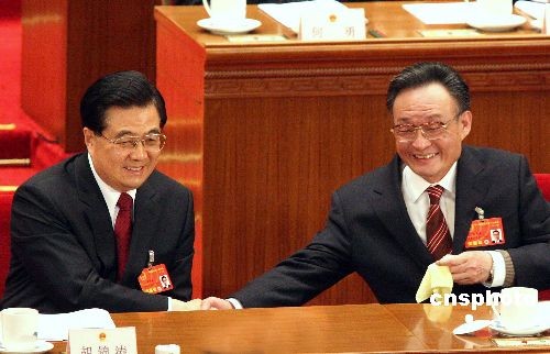 3月8日,十一屆全國人大一次會議第二次全體大會在北京人民大會堂舉行,受十屆全國人大常委會委托,吳邦國委員長作常委會工作報告。圖為報告結(jié)束后,胡錦濤與吳邦國握手。中新社發(fā) 張宇 攝