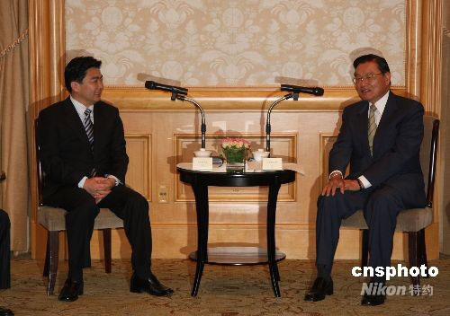臺(tái)灣海基會(huì)董事長(zhǎng)江丙坤(右)十月一日在臺(tái)北西華飯店會(huì)見(jiàn)前來(lái)臺(tái)灣參訪的中共江蘇省委常委、蘇州市委書(shū)記王榮。經(jīng)常到蘇州看望臺(tái)商的江丙坤,希望蘇州在中小臺(tái)資企業(yè)融資、勞動(dòng)合同法的實(shí)施及臺(tái)資企業(yè)后續(xù)發(fā)展的土地三個(gè)問(wèn)題上,更多地向臺(tái)商提供輔導(dǎo)和協(xié)助。中新社發(fā) 耿軍 攝