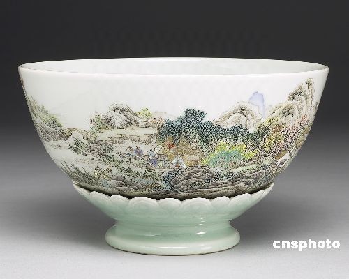 圖為展出的“磁胎洋彩山水詩意轉(zhuǎn)旋大碗”。