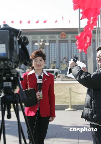 三月三日下午,全國政協(xié)十一屆一次會議在北京人民大會堂開幕,地方電視媒體記者盛裝進行現(xiàn)場報道,關(guān)注大會議程。中新社發(fā) 毛建軍 攝