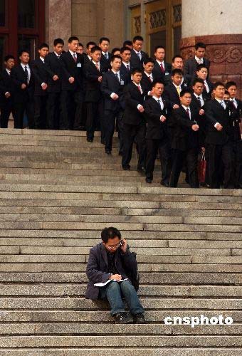 三月八日上午,全國政協(xié)十一屆一次會議第二次全體會議在北京人民大會堂舉行,十四位政協(xié)委員圍繞經(jīng)濟建設和社會建設等問題作大會發(fā)言。會后,一名忙碌的記者坐在臺階上與列隊而出的兩會服務人員相映成趣。中新社發(fā) 盛佳鵬 攝