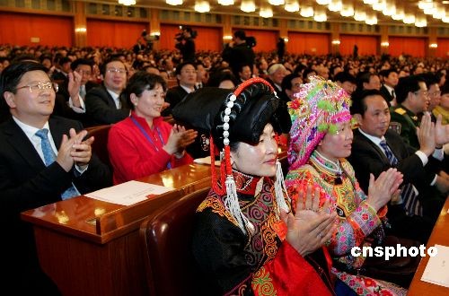 圖:人大代表祝賀胡錦濤再次當(dāng)選