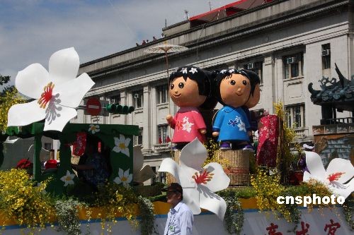 十日上午,一些推廣本地經(jīng)濟(jì)、文化特色的花車,駛過臺(tái)北市區(qū)。圖中這輛由臺(tái)灣“客委會(huì)”布置的花車在宣傳如何弘揚(yáng)客家文化。中新社發(fā) 耿軍 攝