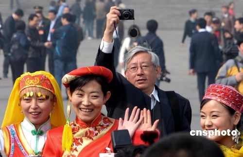 3月10日上午,十一屆全國人大一次會議在北京人民大會堂舉行第三次全體會議。香港鳳凰衛(wèi)視著名主持人曹景行,在大會堂外抄后路偷襲抓拍靚麗的少數(shù)民族代表。中新社發(fā) 廖攀 攝