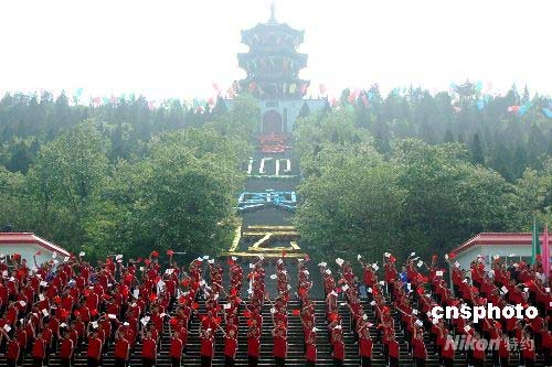 四月二十九日,一萬余名武術(shù)學(xué)校的學(xué)生在河南省登封市迎賓公園,以少林太極拳擂響大中原為主題,舉行迎接北京奧運(yùn)會(huì)倒計(jì)時(shí)一百天慶典活動(dòng)。 中新社發(fā) 李志全 攝