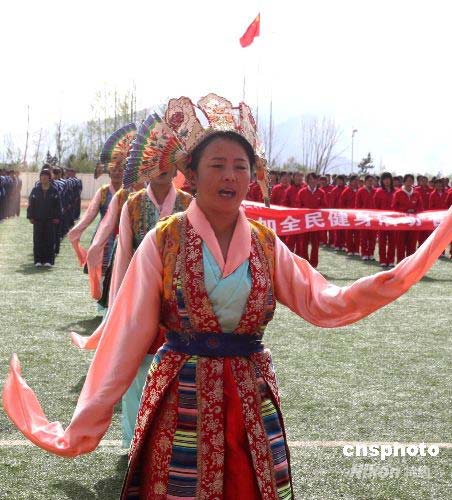 4月30日上午,西藏拉薩舉行迎奧運(yùn)倒計(jì)時(shí)一百天群眾體育慶典活動(dòng),各族各界民眾一千多人聚會(huì)西藏大學(xué),以民族歌舞等方式祝福北京奧運(yùn)會(huì)圓滿成功。中新社發(fā) 柳俊武 攝