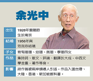 余家上上下下、里里外外,都范我存打理;余光中管理的,唯有一大方書案,與車子的方向盤。詩人不挑食、不挑衣,“太太弄什么,便吃什么;給什么,就穿什么!”