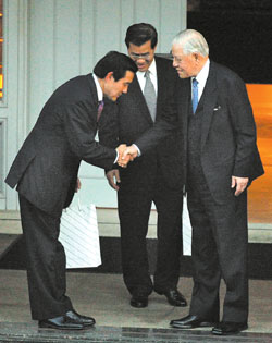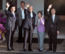 馬英九、蕭萬長27日下午4時半抵達李登輝寓所翠山莊。李登輝和夫人曾文惠在門口迎接馬蕭,四人臉上堆滿笑意。李登輝、馬英九主動向守候媒體揮了揮手,隨后一起走進屋內。