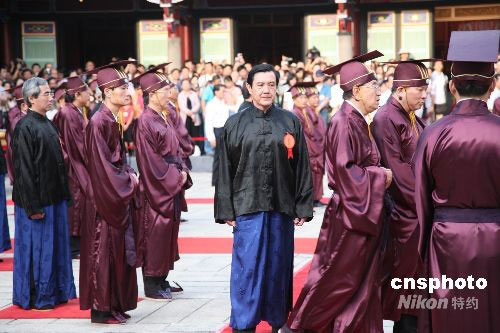 臺(tái)北孔廟五日清晨舉行孔子誕辰釋奠典禮。臺(tái)北市長(zhǎng)郝龍斌擔(dān)任主祭官,臺(tái)北市政府民政局局長(zhǎng)黃呂錦茹擔(dān)任糾儀官。馬英九身穿紫色長(zhǎng)袍、黑色馬褂,進(jìn)入大成殿,向孔子行上香禮,向孔子行三鞠躬,司儀恭讀馬英九的祝文。馬英九還獻(xiàn)上寫有“道貫德明”的匾額。