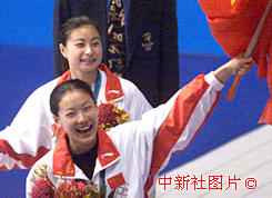 伏明霞獲得女子3米板冠軍 2000年9月29日 08:41 ![]() 中國女子跳水選手伏明霞、郭晶晶二十八日在悉尼奧運會三米跳板比賽中分別獲得金牌和銀牌后,揮舞五星紅旗向觀眾致意。中新社傳真 李剛 攝