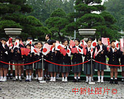 日本首相森喜朗今天在日本東京迎賓館舉行隆重的歡迎儀式,歡迎中國總理朱镕基總理訪日。圖為日本橫濱山手中華學(xué)校的華僑小學(xué)生揮舞中日兩國國旗列隊(duì)歡迎。中新社記者:王曉暉