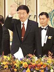 中國總理朱镕基18日在韓國經(jīng)濟四團體舉行的午餐會上向韓國經(jīng)濟界的來賓揮手致意。中新社記者 王曉暉 攝