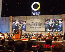 亞歐會議閉幕式,中國總理朱镕基的形象出現(xiàn)在主席臺的的屏幕上。中新社記者:王曉暉 攝