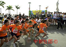 澳門回歸一周年到來之際,澳門中華總商會青年委員會十七日舉行一系列慶;顒,圖為在觀音像前舉辦的環(huán)湖長跑比賽。中新社傳真 宗金柱攝