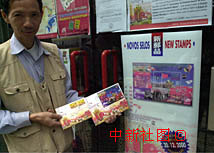 圖文:澳門郵政局20日發(fā)行澳門特區(qū)成立一周年紀念郵票 2000年12月20日 13:51 ![]() 澳門郵政局20日發(fā)行澳門特區(qū)成立一周年紀念郵票,專門從香港乘早班船到澳門訂購郵票的朱炳然先生高興的展示排隊選購到的紀念郵票。中新社傳真洪少葵攝
