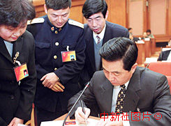 胡錦濤為人大代表們在首日封上簽字 2000年3月12日 09:35 ![]()