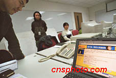 2月5日晚,有“歌壇常青樹”美譽的臺灣歌手蔡琴在臺灣通過長途電話與新浪網(wǎng)友進行聊天。蔡琴還將于2月14日至17日在北京領(lǐng)銜主演的大型音樂劇《天使--不夜城》。圖為工作人員在通過電話聯(lián)系蔡琴,電腦里正顯示著有關(guān)蔡琴資料的主頁。中新社圖 陸云 攝