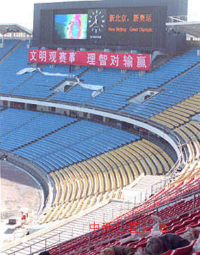 北京為申辦2008年奧運(yùn)會而改建三個重要場館,其中工人體育場的新型電子顯示屏已經(jīng)基本調(diào)試完畢。中新社記者 李剛 攝