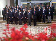 中國(guó)國(guó)家主席江澤民二十六日在海南博鰲水城集體會(huì)見(jiàn)出席亞洲論壇的貴賓,并在鮮艷的紅花叢前,與這些亞洲國(guó)家的前政要們和論壇秘書(shū)長(zhǎng)合影。中新社記者 賈國(guó)榮 攝