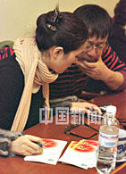 全國政協(xié)委員、著名影星鞏俐和姜文,周日參加政協(xié)文藝組討論會間隙研究新影片。中新社記者 劉可耕 攝