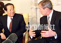 美東時間二十二日,中國國務院副總理錢其琛與美國總統(tǒng)布什在白宮會晤。會晤前,他們共同會見了記者。中新社圖 胡啟華 攝