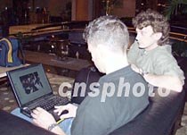 四月三日夜間至四日凌晨,?谖娜A大酒店中外記者云集,準(zhǔn)備采訪美國駐華使館預(yù)定在這里舉行爾后取消的記者招待會(huì)。圖為兩名美聯(lián)社記者在現(xiàn)場用電腦發(fā)稿。中新社記者 莫成雄 攝