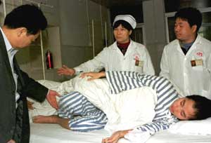 圖文:昔日跳樓“護法” 如今重獲新生 2001年4月11日 14:26 ![]() 因跳樓造成四肢、腰椎骨折的高州市“法輪功”輔導站站長劉冰,在高州市人民醫(yī)院醫(yī)護人員的精心救治下,身體恢復很快,已無終生殘疾危險。(周文杰 攝) 中新網(wǎng)高州四月十一日消息:廣東省高州市一批“法輪功”癡迷者近日在當?shù)卣汀胺ㄝ喒Α鞭D化人員的幫教下,終于迷途知返,重獲新生。 2000年12月,劉冰、伍文瓊等13名法輪功癡迷者在北京跳樓“護法”,造成1死4重傷的慘劇。高州市委市政府將他們接回后,結合當?shù)厍闆r展開了一場全社會共同參與的挽救行動。到目前為止,全市包括他們在內的140名“法輪功”癡迷者中,已有86%得到轉化。(據(jù)新華社) |