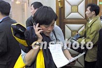 參加中國(guó)外交部11日在北京舉行的美國(guó)關(guān)于撞機(jī)事件的致歉信記者招待會(huì)的記者們?cè)谡写龝?huì)現(xiàn)場(chǎng)用手機(jī)忙于發(fā)稿。中新社記者 李剛 攝