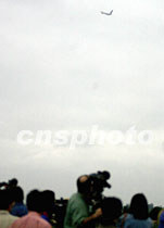 中外記者十二日凌晨七時許在中國海南省海口市美蘭機場邊,遠遠地目擊搭載美國軍用偵察機機組人員的美專機起飛離境。中新社記者 賈國榮 攝
