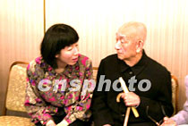 一代圍棋名家吳清源與前中國棋手、現(xiàn)在代表韓國出戰(zhàn)的芮乃偉女士(左),在第十四屆富士通杯世界圍棋冠軍賽抽簽儀式上交談。中新社圖 陶光雄 攝