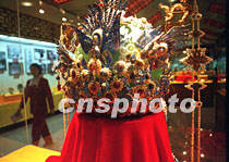 北京定陵出土的明代“六龍三鳳冠”29日在剛剛落成的明十三陵博物館展廳內(nèi)展出。此次“神秘的帝王幽宮”歷史文物展展示了包括萬歷皇帝金絲翼善冠、嵌有大塊祖母綠寶石的大碌帶等四百余件稀世珍寶。中新社圖 鄭萍萍 攝