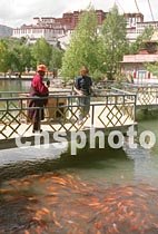 西藏拉薩市布達拉宮下的廣場水池中放養(yǎng)了許多錦鯉,形成世界屋脊觀魚的新景觀。中新社記者 趙振清 攝