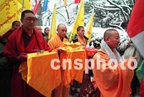 圖:百名僧侶參加紀(jì)念佛教?hào)|傳2000年大法會(huì) 2001年5月9日 19:44 ![]() 中國西藏、云南、江蘇、廣東等地的近百名僧侶二十二日在北京西山靈光寺參加紀(jì)念佛教?hào)|傳2000年大法會(huì)。中新社記者 鄒憲 攝