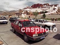 西藏拉薩市目前擁有出祖汽車一千二百輛,近來已更換為上海產(chǎn)的“桑塔納”牌轎車,為外來的游客和當?shù)厥忻癯鲂刑峁┝朔奖。中新社圖 吳新華 攝