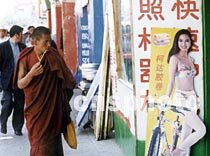 在西藏拉薩市到處可以可見現(xiàn)代生活的沖擊,柯達(dá)膠卷的廣告女郎引起了一位寺院僧人的注目。中新社圖 吳新華 攝