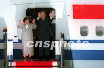 國(guó)家主席江澤民9日結(jié)束訪問(wèn)香港,江澤民主席與夫人王冶坪向送行人士揮手道別。中新社傳真 盧峰 攝