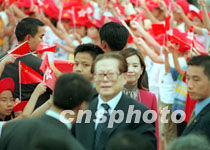 國家主席江澤民9日結(jié)束訪問香港,一百五十名學生在機場歡送。 中新社傳真 盧峰 攝