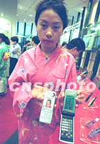 參加北京五月國(guó)際科技博覽會(huì)的日本公司,請(qǐng)公關(guān)小姐身穿和服展示新款可視手機(jī)和掌上電腦。中新社記者 賈國(guó)榮 攝